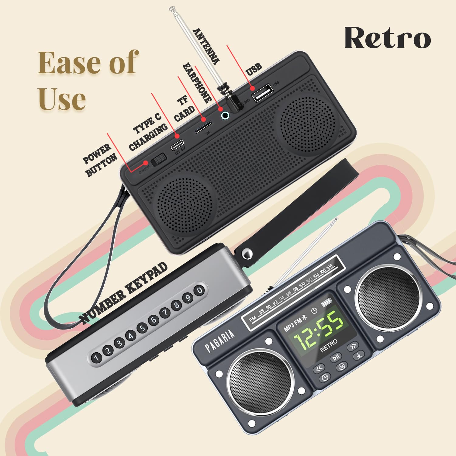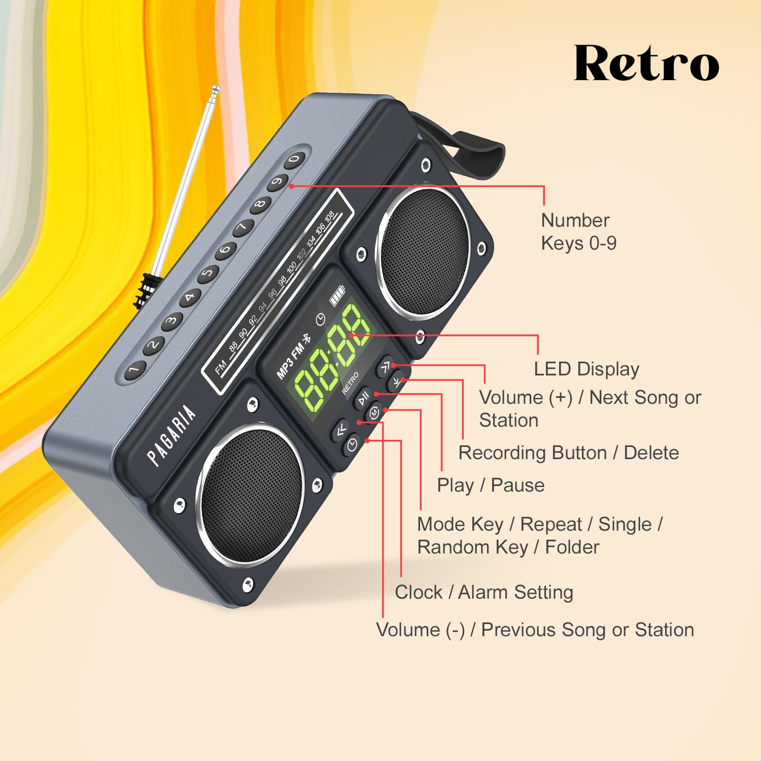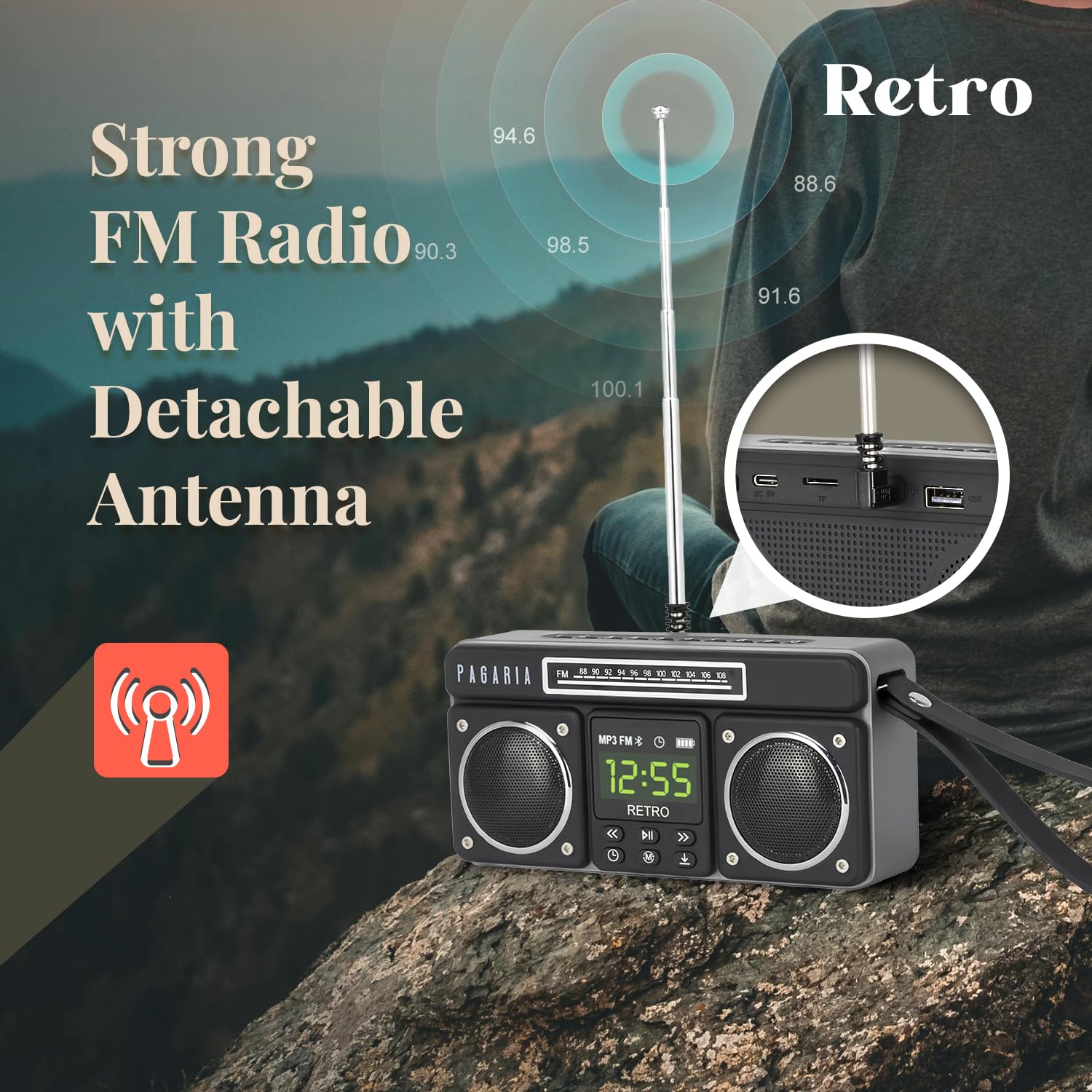 - ✅ FM RADIO WITH DETACHABLE EXTERNAL ANTENNA: A first in Radio’s, the all New RETRO comes with Detachable External Antenna giving highest sensitivity to the Radio to get best reception. New RETRO comes with only FM Band and no other bands. Simple Auto Tune & Manual tuning option makes ease of channel selection with help of Number Keypad. The detachable external antenna is supposed to be mounted on AUX IN Port of the Radio.