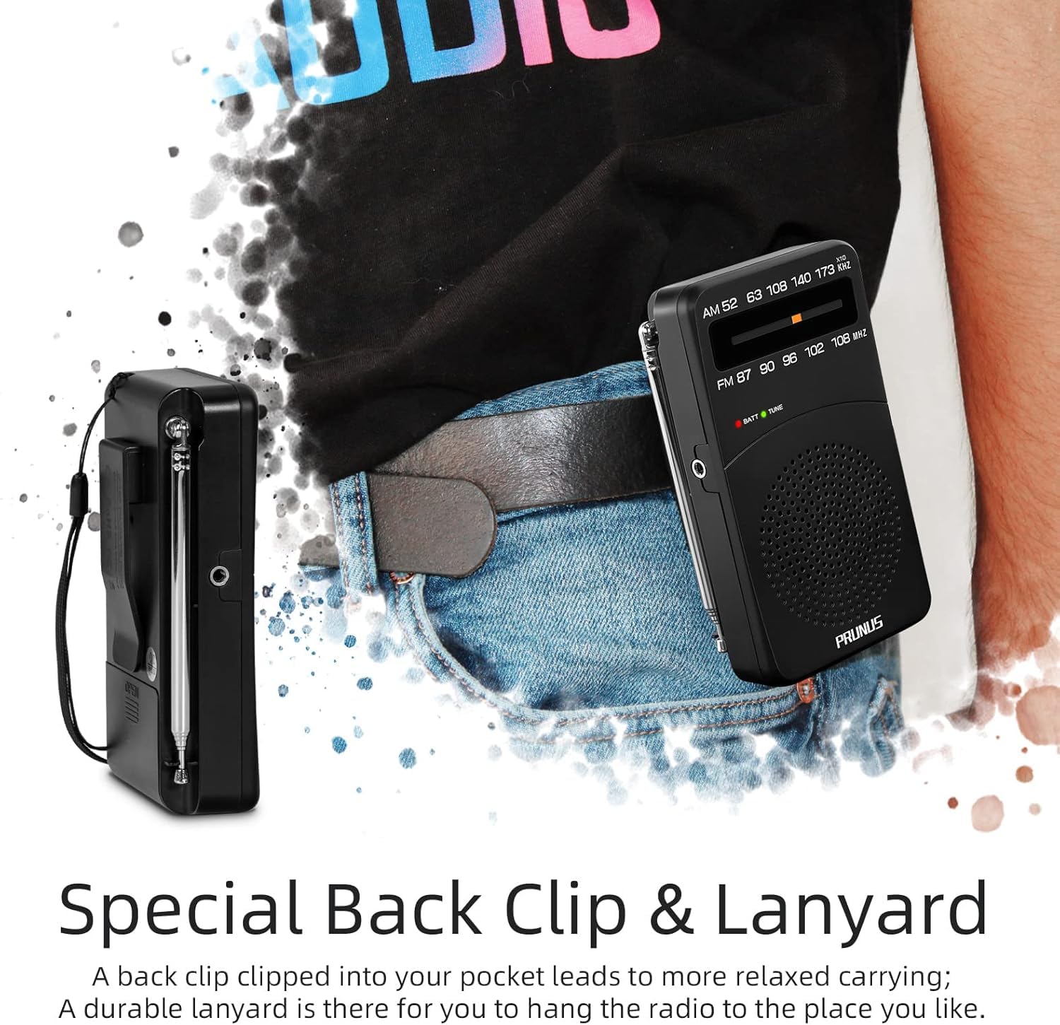 - 【Portable Design】You can hold mini radio by one hand. it’s small enough to put it in emergency kit. This FM AM radio measures 12*6.6*3cm with weight only 145g (without batteries), close to the size of iPhone 7. More importantly, thanks to its back clip and lanyard, transistor radio is pretty easy to carry around whether it’s clipped to pocket or carried with lanyard. Now, take it for morning exercise, stroll or a break in park, together with a piece of brisk music or a great radio show.