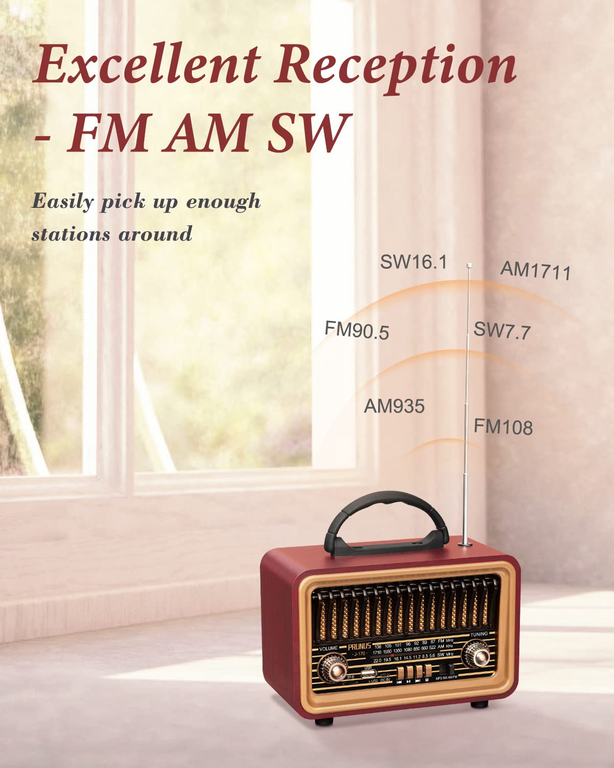 - 【3-Band Radio with Excellent Reception】 Not only an bluetooth speaker retro but also a portable AM FM SW radio. Multiple bands means the retro radio portable can receive more stations in your area and you can get more fun from it. With a long retractable antenna, you can look forward to good reception of this classic radio. The operation is so easy to figure out, one knob for power and volume, one knob for tuning and a button for bands. No confusing buttons, suitable for all ages.