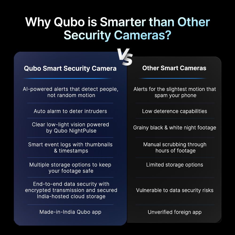 - 【Qubo NightPulse Vision】Equipped with high-performance IR LEDs, the camera delivers sharp and clear visibility in complete darkness, ensuring 24×7 monitoring without compromise.