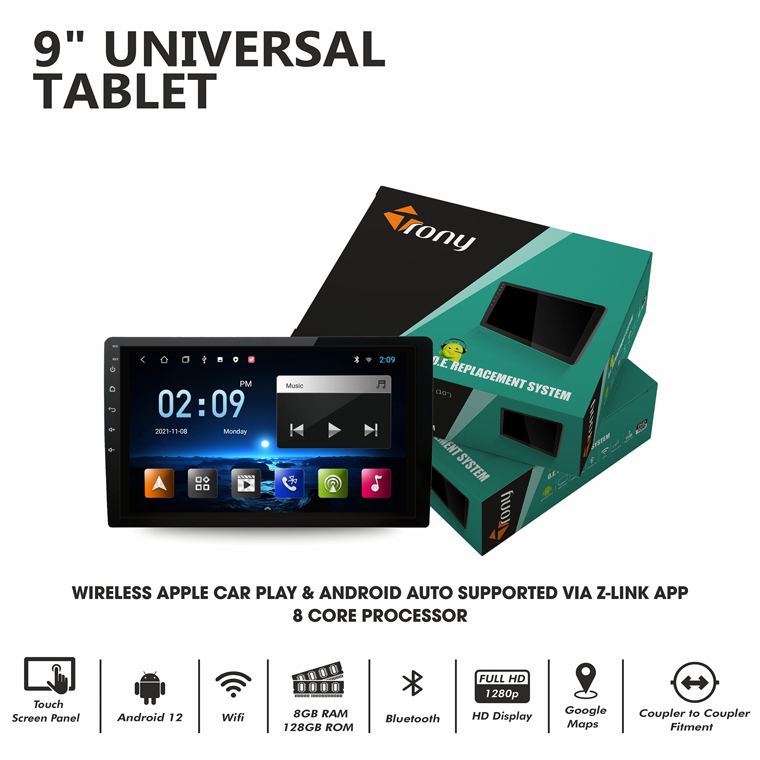 Details: Trony is a highly trusted brand known for manufacturing and delivering premium quality car accessories. The Trony 9-Inch Advanced Android Car Radio Receiver is designed to upgrade your driving experience with its latest Android 12 operating system, Full HD 1280p touchscreen display, and seamless Apple CarPlay & Android Auto support. Equipped with a powerful Octa-Core processor, 8GB RAM + 128GB ROM, and wireless connectivity, this system ensures smooth performance, superior entertainment, and enhanced navigation while on the road.