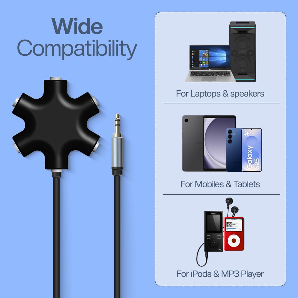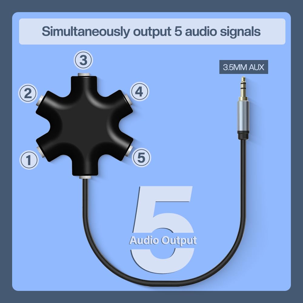 - 【SHARE MUSIC TOGETHER 】Connect up to 5 headphones or speakers simultaneously using this 3.5mm AUX headphone splitter. Perfect for sharing music, movies, or games with family and friends. Simply plug it into any device with an auxiliary port (like phones, tablets, or iPads) and start enjoying together!