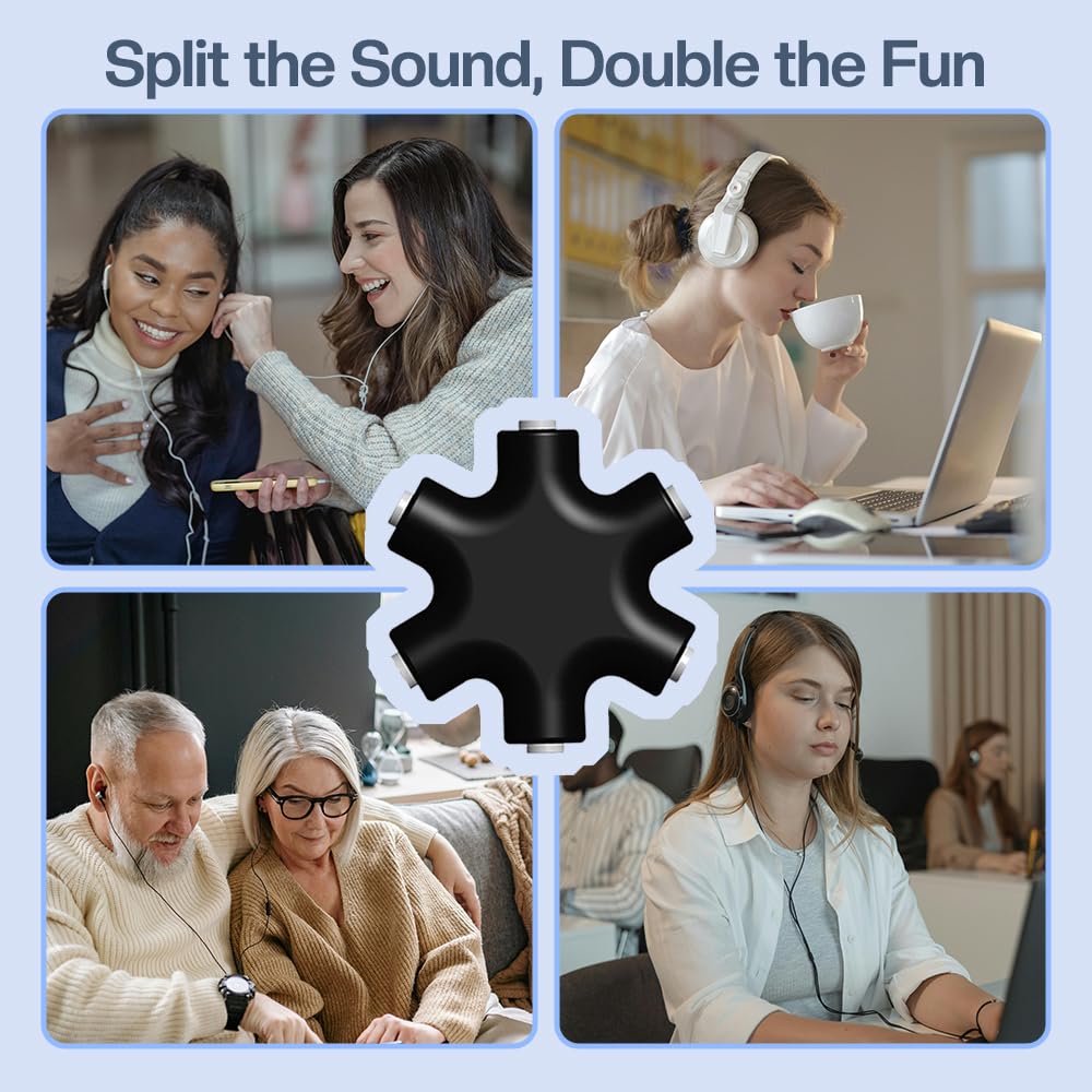 - 【SHARE THE SOUND】Enjoy music, podcasts, or audio clips together with this multi-headphone splitter. Note: Only compatible with devices using a 3.5mm AUX port. Not suitable for Lightning or USB-C ports.