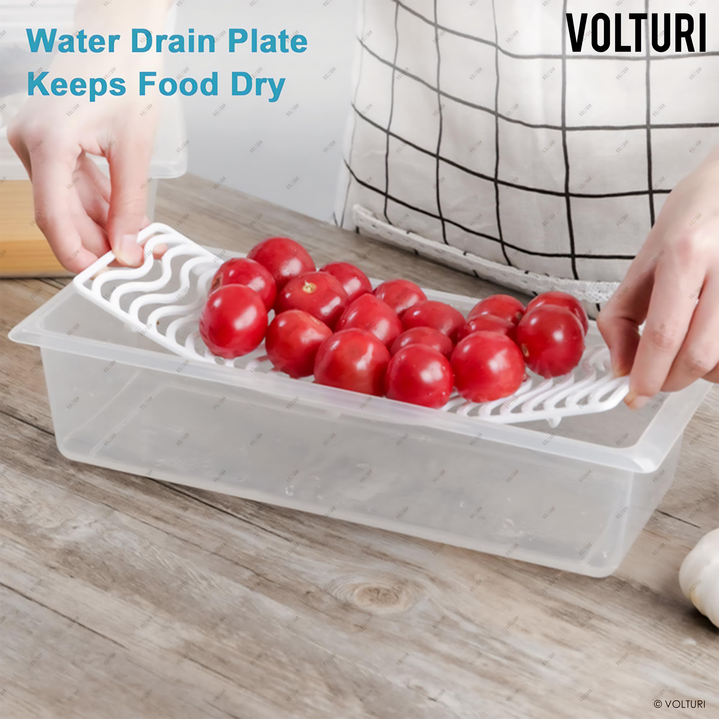 - Built-In Drain Tray: Each fridge container includes a removable water drain tray that keeps produce elevated, preventing contact with moisture. Ideal for storing fresh vegetables, fruits, and more in the fridge or freezer while keeping them clean and dry.