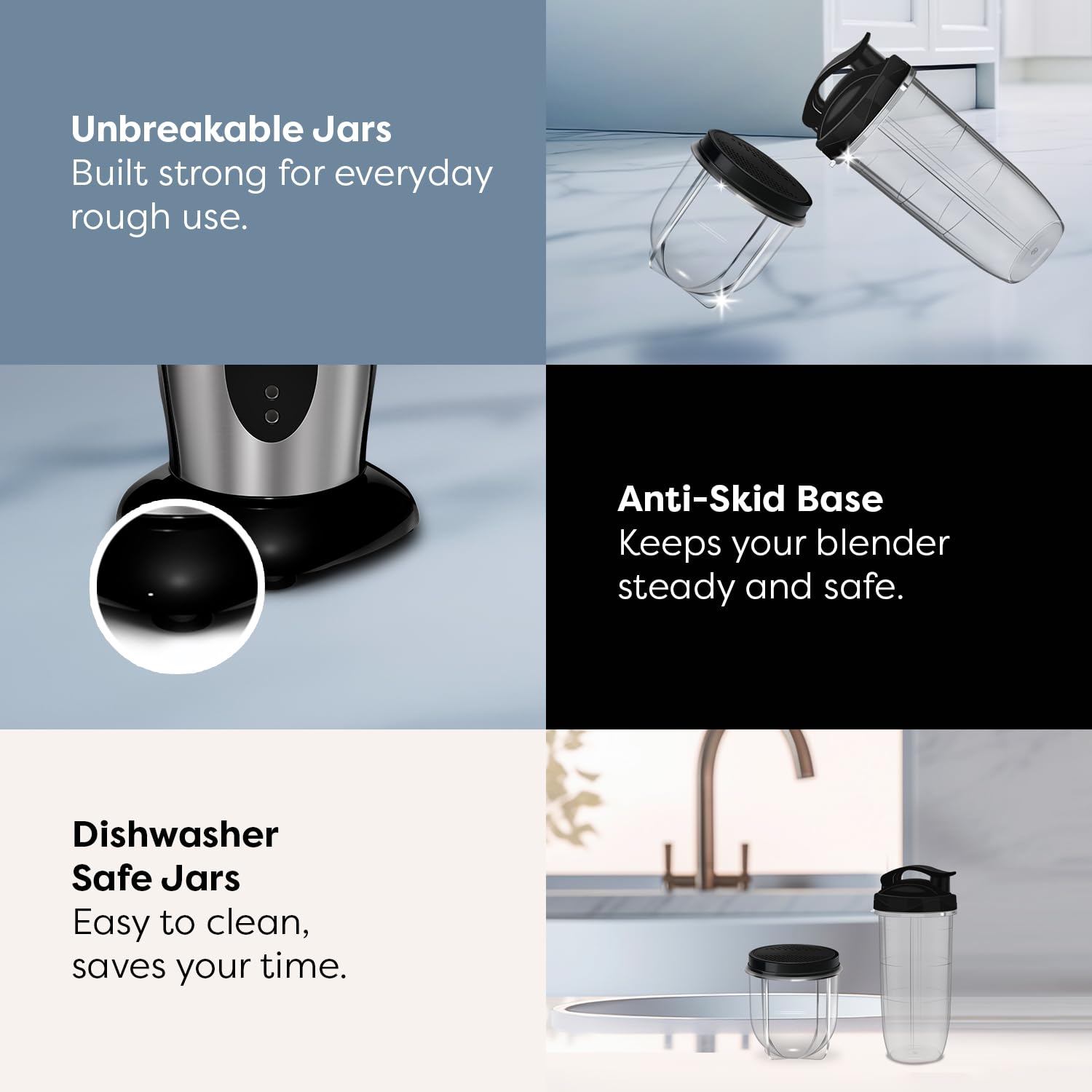 - 2 Unbreakable Jars: Includes a multipurpose jar and a smoothie jar, both made from impact-resistant material
